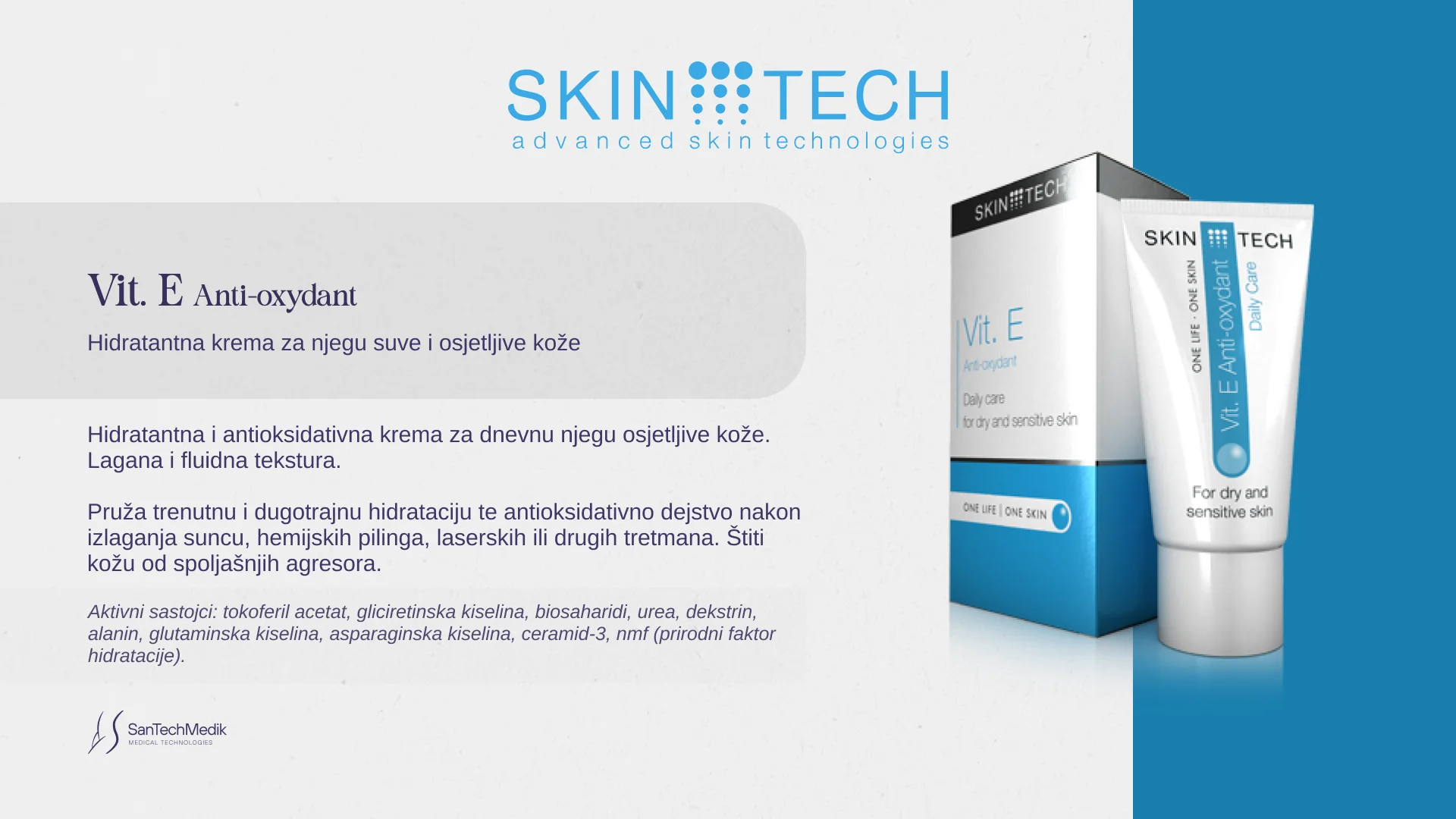 Nakon izlaganja suncu, potrebni su nam posebno formulisani proizvodi koji će nahraniti i umiriti kožu, te joj pomoći da se oporavi. Kreme sa aktivnim sastojcima poput glicerinske kiseline, biosaharida, uree, ceramida i prirodnih faktora vlaženja, kao što je Skin Tech Vit. E anti-oxydant, pružaju intenzivnu hidrataciju i antioksidativnu zaštitu.